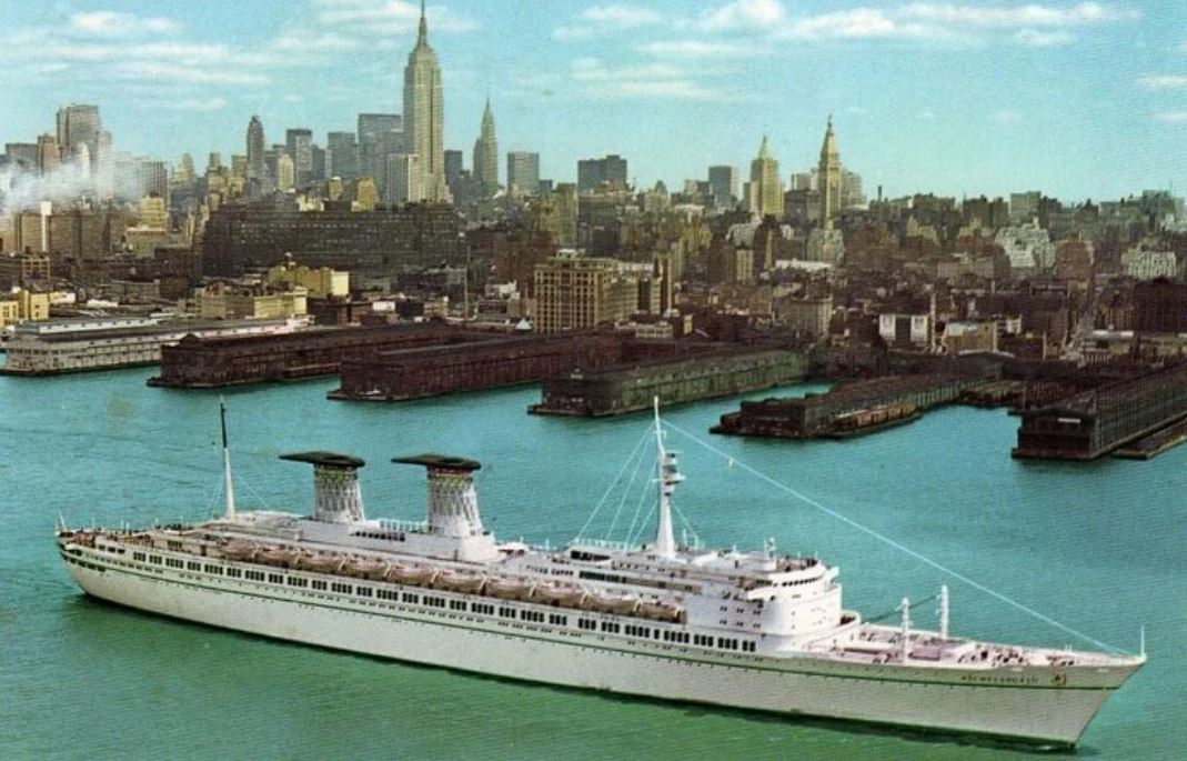 Элегантный лайнер «Микеланджело» направляется через Атлантику в Нью-Йорк. 275-метровый красавец оборудован стабилизаторами качки, чтобы богатые пассажиры не пролили ни капли мартини.