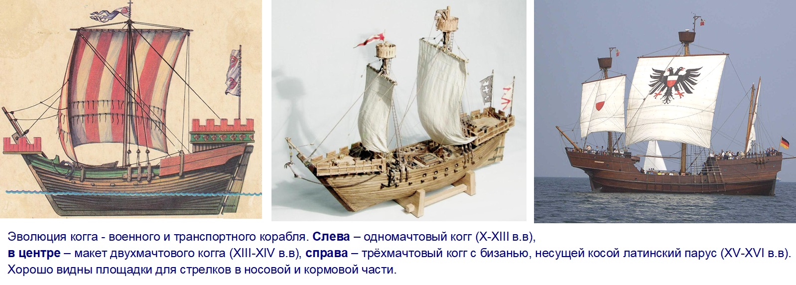 Желание увеличить площадь парусов и улучшить управляемость кораблей привело корабелов к увеличению количества мачт. Ещё во времена Римской Империи на кораблях стали устанавливать две мачты, появилась носовая наклонная мачта – бушприт. А в начале XV века в уже и в городах Ганзейского Союза (Союз торговых городов на территории Северо-Западной Европы) и в Испании вместо одномачтовых коггов стали строить двухмачтовые когги с прямыми парусами. Когг был первым, полностью парусным (не гребным!) военным и торговым кораблём. Дальнейшее развитие мирового судостроения ознаменовалось переходом в середине XV века к трехмачтовым судам. На кораблях начали появляться: передняя мачта – фок, центральная мачта – грот и задняя мачта – бизань. Трёхмачтовые суда обладали хорошей парусной вооружённостью и отлично держали курс (паруса на бизани являлись хорошим стабилизатором курса, не позволяя судну рыскать на волне).