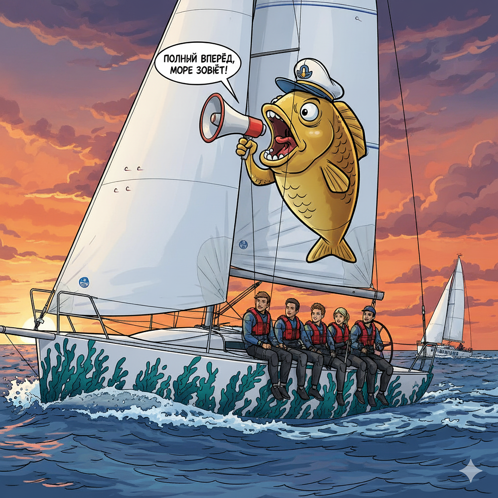 «Появилось название во время регаты под предводительством крутого, но сурового шкипера: то самое чувство, когда от волнения забываешь, как называются снасти, но вывозишь на интуиции, везении и взаимовыручке. Есть роскошный мультфильм Саакянца — „Ух ты, говорящая рыба“. Его абсурдные диалоги, находчивость главного героя и общий вайб идеально описывают наш подход к яхтингу. А на моей шапке была надпись „Летучая рыба“ — тут-то всё и сошлось».