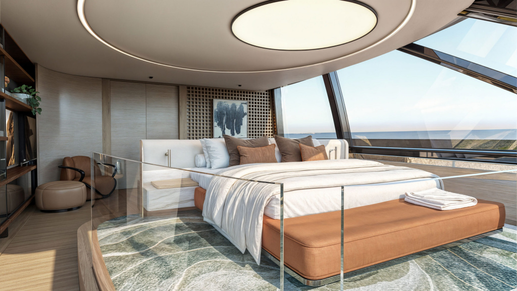 Среди ключевых особенностей — мастер-каюта на главной палубе: просторный двухуровневый люкс с обилием естественного света и панорамными видами. Гостевые каюты, расположенные на нижних палубах, включают VIP и четыре гостевые каюты, каждая из которых обеспечит комфорт и уединение для длительных путешествий.