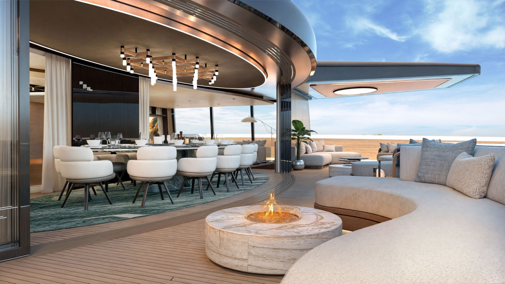 Другие примечательные аспекты включают гибкие социальные зоны с сочетанием открытых и неформальных пространств — например, пляжный клуб с джакузи в кормовой части. Размещение экипажа продумано таким образом, чтобы обеспечить максимальную эффективность работы и сохранить приватность гостей. Для этого предусмотрены отдельные рабочие зоны.