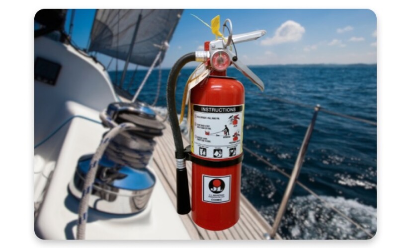 ДвигательОгнетушитель следует держать рядом с двигателем на случай пожара. Кроме спасательных жилетов, огнетушитель — второй прибор на борту, который постоянно должен проходить техосмотр и перезарядку. В критической ситуации важна работоспособность этого инструмента.