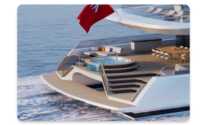 Так, каюты гостей и экипажа будут располагаться на нижней палубе. На верхней палубе количество тентов и надстроек будет минимизировано для сохранения визуальной легкости и необходимой циркуляции воздуха. В миделе архитекторы расположили зону для хранения тендеров, что позволило освободить кормовую часть и превратить ее в большую зону отдыха. На корме также располагается платформа для купания, имеющая несколько уровней для облегченного доступа к воде.