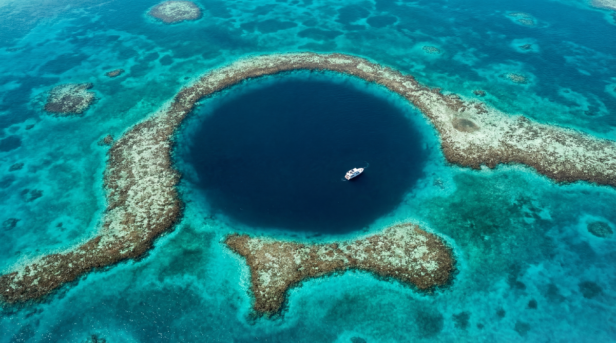 Сверху это выглядит как гигантский зрачок. Тёмно-синий круг диаметром 150 метров посреди бирюзового залива в Карибском море — будто кто-то проделал дыру в морском дне и забыл заткнуть.